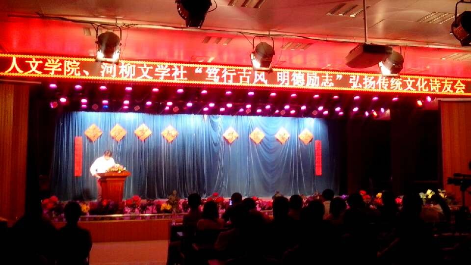 6月8日下午7点,人yl9193永利集团、河柳文学社联合举办的“笃行古风,明德励志” 弘扬传统文艺诗会在萃文厅顺利召开,人yl9193永利集团副教授严英秀、人yl9193永利集团分团委书记岳芳、图书馆办公室主任杨晓雯、图书馆流通部主任张秀峰、兰州大学五泉学社,兰州理工大学行星诗社,西北师范大学知行学院原上草文学社,省经贸学院金鹰文学社,甘肃建筑学院建院风文学社,定西师专浩瀚文学社,省警察学校警苑文学社及12级全体学生近500人观看了本次诗友会。