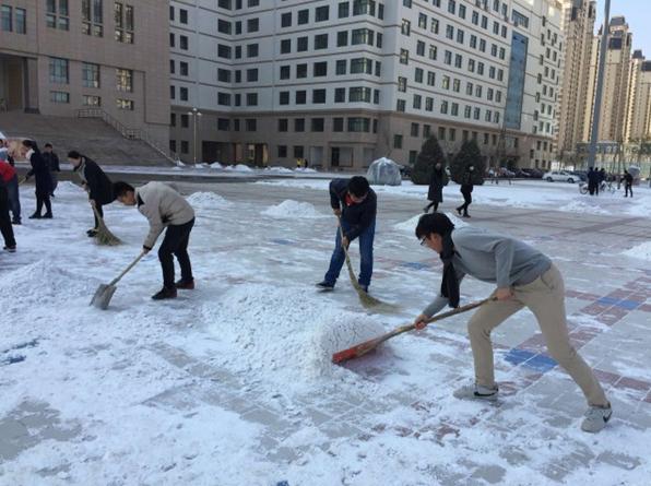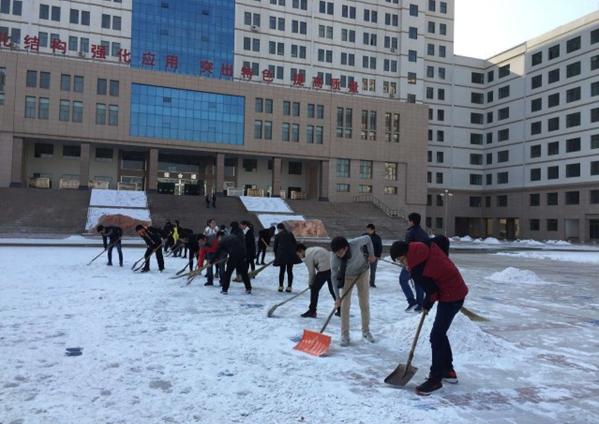 天气再寒冷,也阻挡不了同学们的热情。同学们挥舞着铁锹和笤帚,相互配合,你铲我扫,一点点地将积雪和冰层铲起集中堆放。激情驱散寒冷、汗水消融冰雪,经过一个小时的奋战,安亭广场东侧大部分积雪被清扫干净,方便了广大师生的出行,同时也是对入党积极分子的一次义务劳动教育。