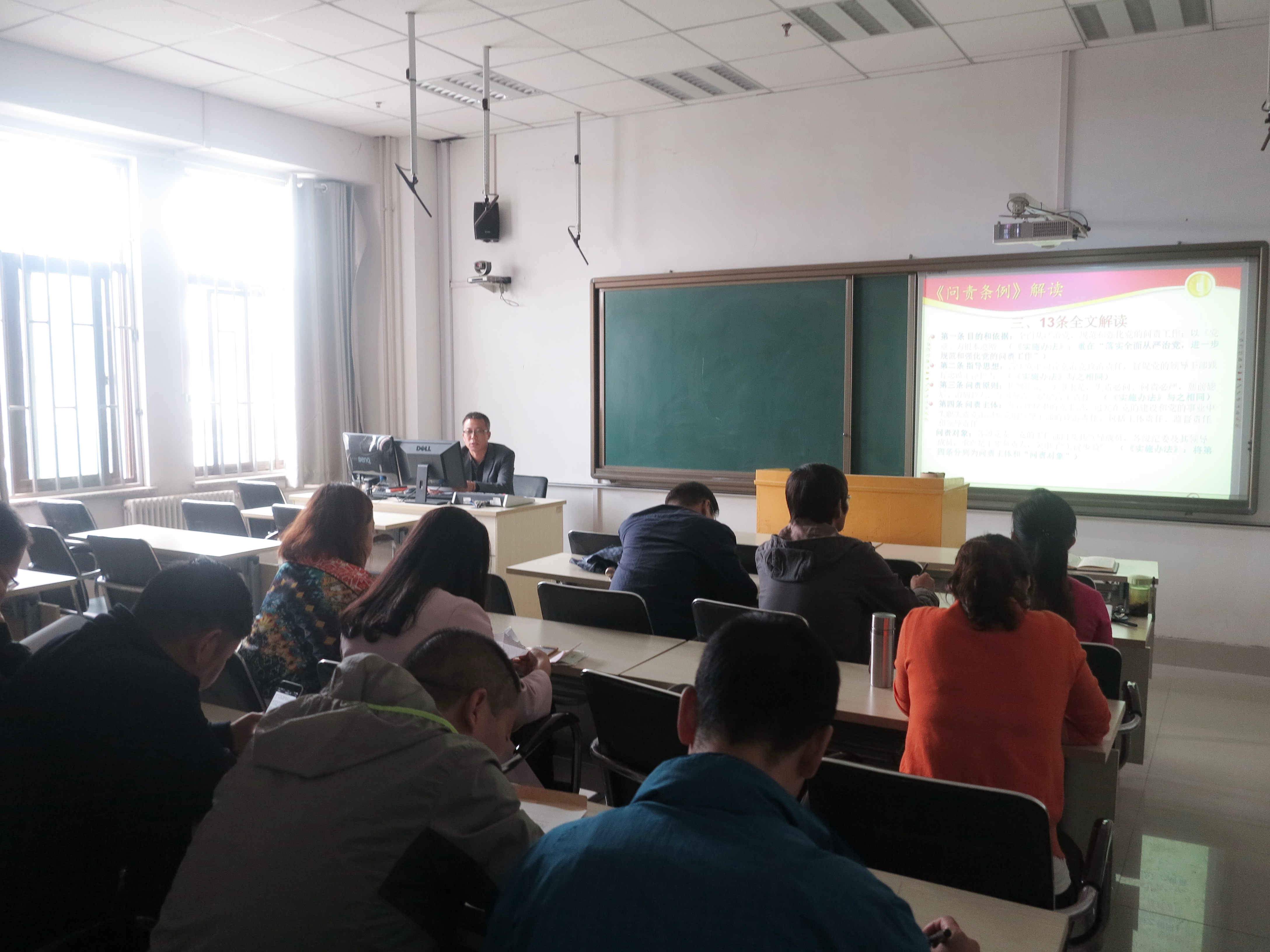 会上凌书记从《问责条例》重大意义、《问责条例》制定背景、13条全文解读详细讲解了《中国共产党问责条例》。他说:“《问责条例》以党章为根本遵循,以习近平总书记系列重要讲话这一马克思主义中国化最新成果为指导,以全面从严治党为目标方向,扎紧问责的制度笼子,释放“失责必问、问责必严”的强烈信号,对于落实党组织管党治党的政治责任和督促党的领导干部践行忠诚干净担当,具有十分重要的意义。它与《中国共产党廉洁自律准则》《中国共产党纪律处分条例》《中国共产党巡视工作条例》一起,构成了以党章为遵循、以责任为导向的制度体系。条例立足于全面从严治党新实践,通过整合规范现行各类问责制度,实现了问责内容、对象、事项、主体、程序、方式的制度化、程序化。我们必须深刻认识到,《问责条例》是对权力与责任关系的进一步廓清。条例从党内法规的层次,把权力与义务、责任与担当有机统一起来,充分体现了“有权必有责、有责要担当、失责必追究”的精神,有利于党员干部树立正确的权力观、责任观。我们必须深刻认识到,《问责条例》是进一步落实“两个责任”的制度保障。条例坚持问题导向,剑指当前管党治党存在的突出问题,明确把主体责任、监督责任落实不到位,管党治党失之于宽松软等现象,作为必须问责的情形,特别是强调对问责工作的再问责,具有很强的现实性、针对性,有利于推动“两个责任”落深落细落实。归根到底,我们必须深刻认识到,中央出台《问责条例》的最终目的,不是为了问责,而是促进负责,督促各级党组织和党员领导干部牢记“权力”更多是责任、是担当,绷紧责任的弦,践行自己的承诺,做好自己该做的事,真正做到从一而终、坚守初心、终身负责。党员领导干部要自觉贯彻执行《问责条例》,不断强化“一事未办妥,寝食难安;一事有闪失,如芒在背”的责任感,知难而进、锲而不舍、乘势而上,更好地为学校转型发展和合格应用型本科建设做贡献,用担当的实际行动诠释对党和人民的忠诚。