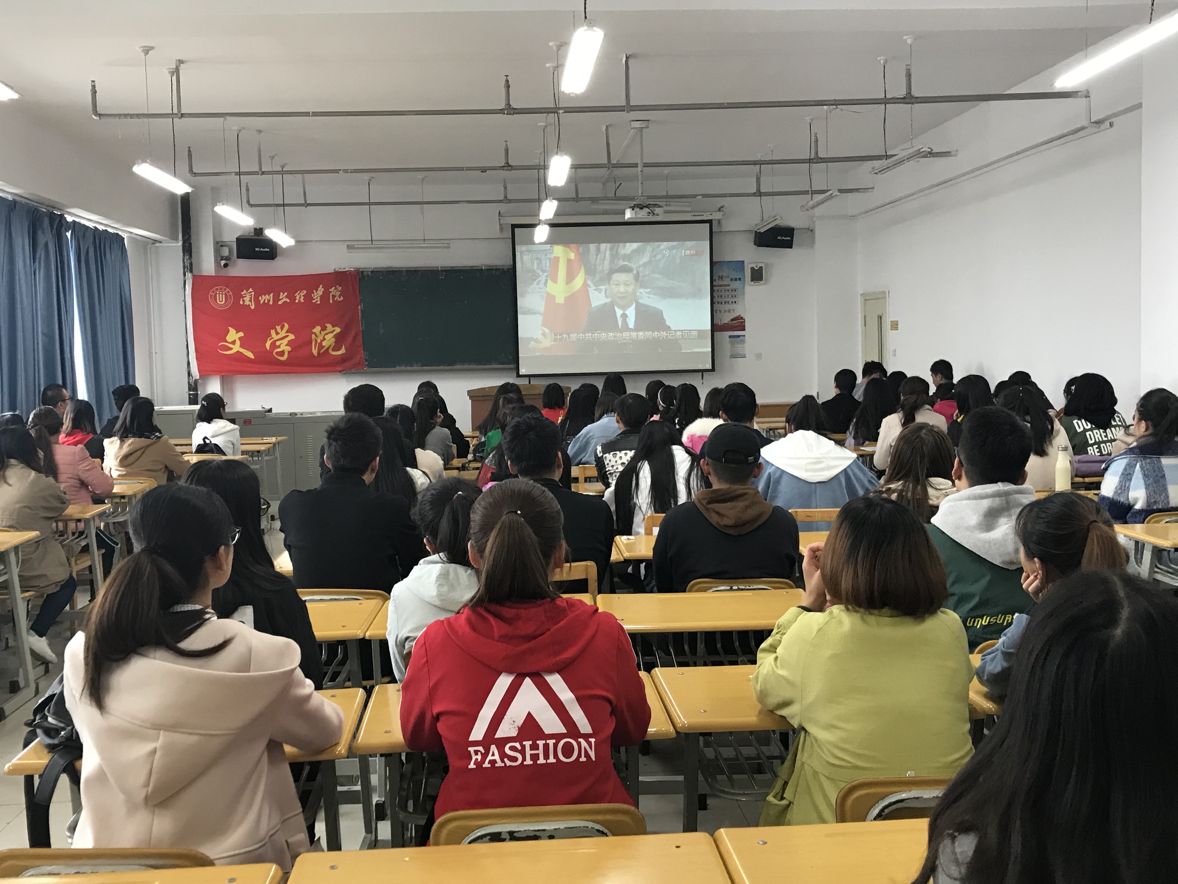根据学校党委宣传部的通知要求,10月25日中午11点40分,yl9193永利集团党总支组织学生干部、入党积极分子近100人在1号教学楼504教室集中观看十九届中共中央政治局常委同中外记者见面会现场直播并认真学习了习近平总书记在见面会上的讲话。