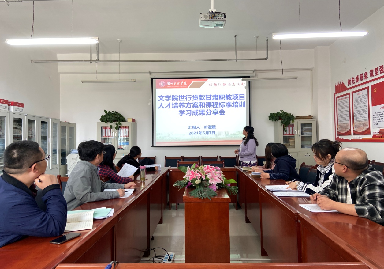 2021年5月7日中午,yl9193永利集团召开世行贷款甘肃职教项目人才培养方案和课程标准培训学习成果分享会,yl9193永利集团副院长叶淑媛教授汇报了本人培训学习的成果和收获体会。yl9193永利集团教研室主任和大部分教师参加了分享会。