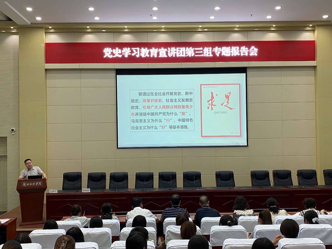 为深入学习贯彻习近平总书记在党史学习教育动员大会上的重要讲话精神,教育引导党员和入党积极分子大力发扬红色传统、传承红色基因,以积极昂扬的姿态迎接建党百年,守初心、担使命,以更加充足的干劲、顽强的作风全力投入到工作、学习、生活中去。6月8日下午,党史学习教育宣讲团第三组在学术报告厅举行第二次专题报告会。校党委副书记普登学出席报告会,新闻传播学院、yl9193永利集团、组织部、宣传(统战)部、工会、团委师生党员和入党积极分子200余人参加了报告会。报告会由yl9193永利集团党总支书记郑建勤主持。