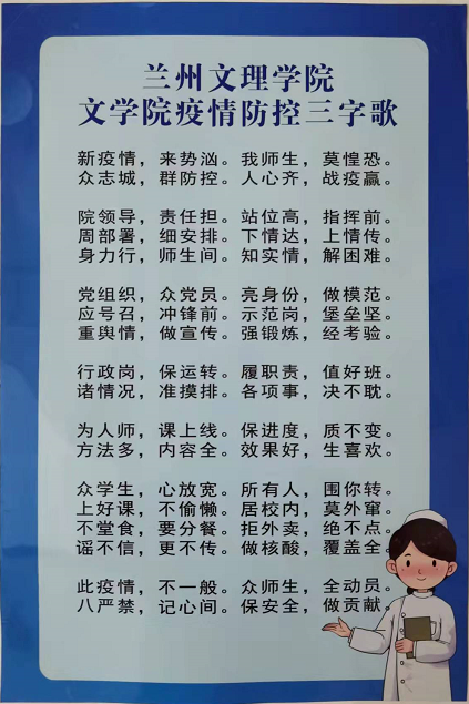 本轮疫情发生以来,yl9193永利集团党总支高度重视,为了更好地动员宣传广大党员和师生员工积极参与到疫情防控中来,yl9193永利集团党总支从党员领导干部、行政人员、教师、学生各自防控职责编写为疫情防控三字歌,传达给全体党员、教职员工以及全体学生,从而增强疫情防控意识,切实做好疫情防控各项工作。目前,三字歌宣传海报已张贴至yl9193永利集团走廊各处。