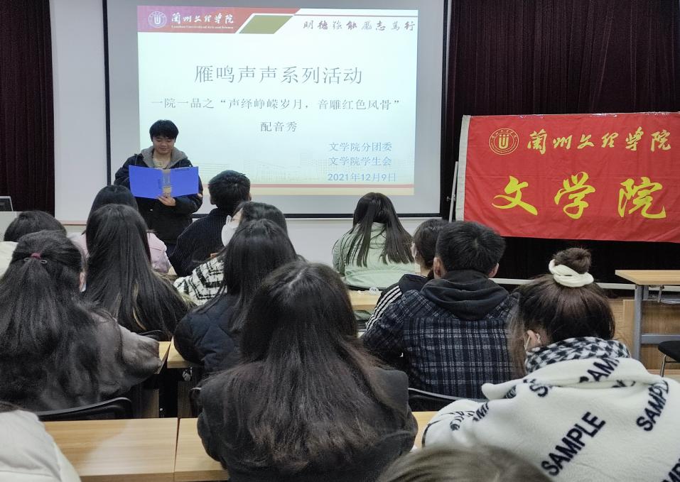 恰逢中国共产党百年华诞,为让同学们更好的了解党的故事,传递红色基因,营造积极向上的氛围,丰富课余生活,我院于2021年12月4日举办了“雁鸣声声——经典咏流传”系列文化传承活动之“声绎峥嵘岁月,音雕红色风骨”主题配音秀活动。