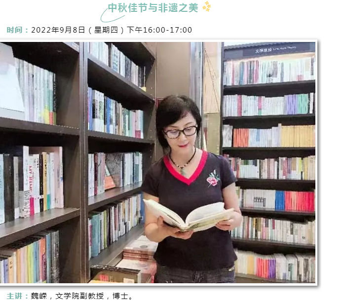 9月8日下午,非遗系主任魏嵘副教授、博士在中秋佳节到来之际,为学生做了《中秋佳节与非遗之美》的讲座,介绍了民俗节日中秋节的知识,引导学生体会中华传统优秀文化的内涵与魅力。