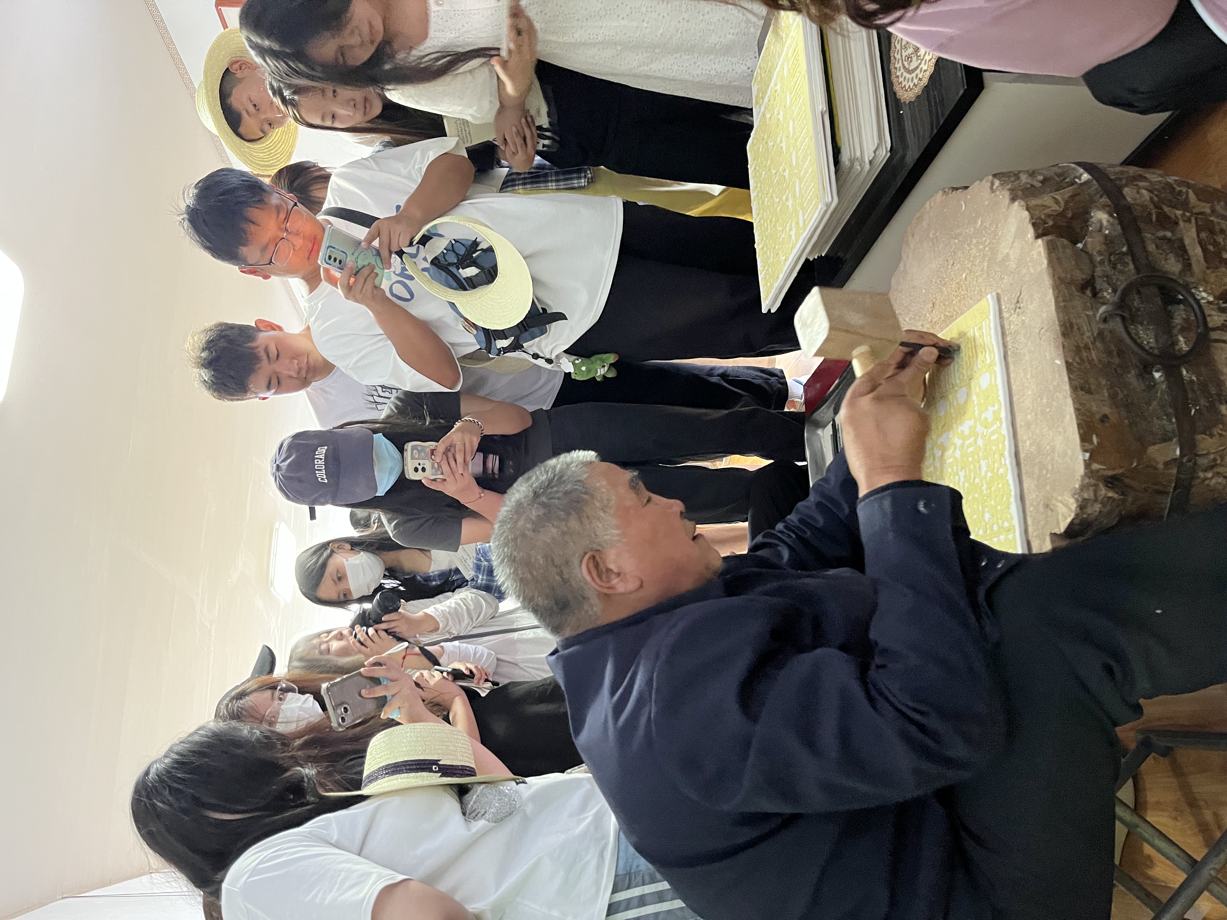 参观扇鼓舞,这是传统民俗庙会中的一种祭神祈福仪式,表演中节奏感强烈,表达了人们对美好生活的期待,尤其在后半部分一边敲打扇鼓一边甩头上的辫子,四人一组,表演难度加大,展示过程中也体现出传承人年龄较大的问题,引起同学们的思考。