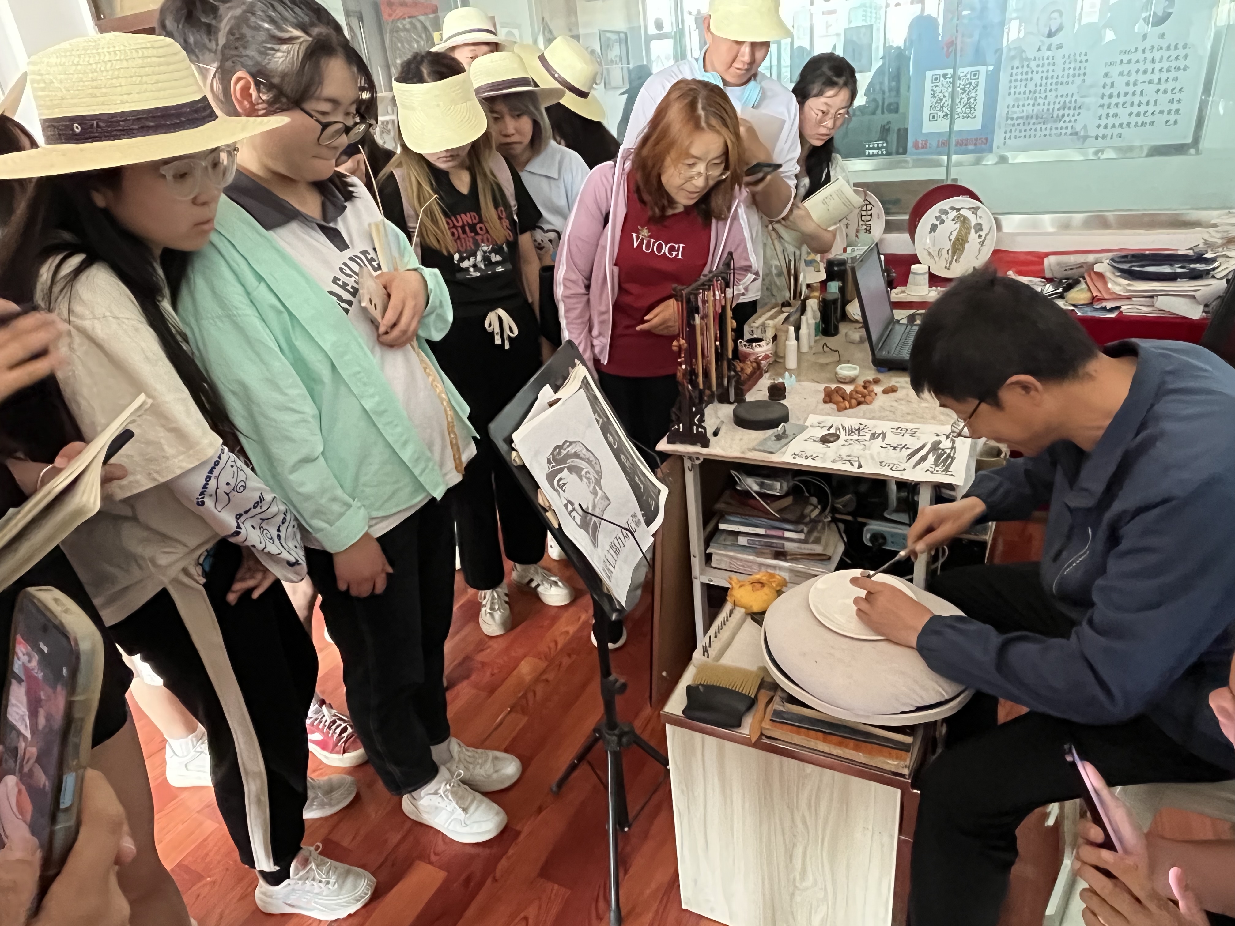 在通渭县参观悦心非遗展厅,同学们现场观看了通渭麦秆画、刻瓷等非遗项目,精美细致的图案表达了传承人对生活的热爱。