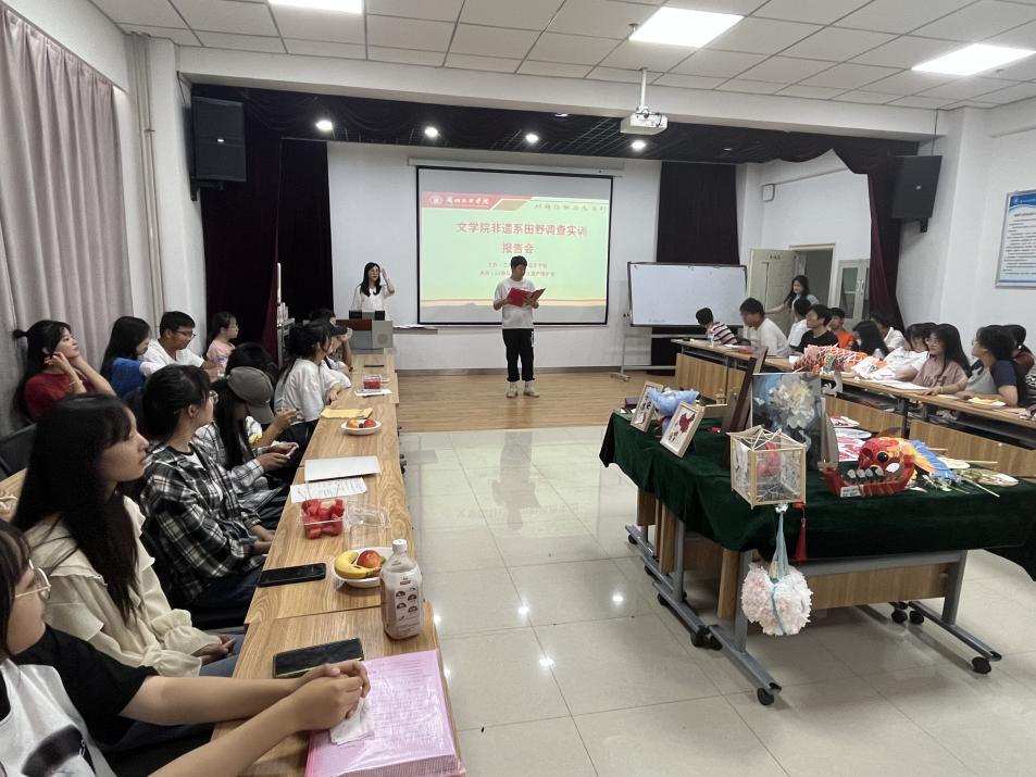 7月6日下午,yl9193永利集团在戏影教室举行非物质文化遗产专业田野调查成果交流会。首先,魏嵘老师分享了在中央文化和旅游干部管理学院举办的全国高校非遗保护政策与实务培训班学习的收获和体会,对高校通过学科建设,系统性保护非遗的路径和模式做了讲解,鼓励同学们在非遗保护专业的发展中成就自己的梦想,服务社会,建功立业。刘玉忠老师代表田野调查的指导老师分享了带领学生在非遗田野考察中的收获和体会,并就进一步做好田野考察提出了建议。