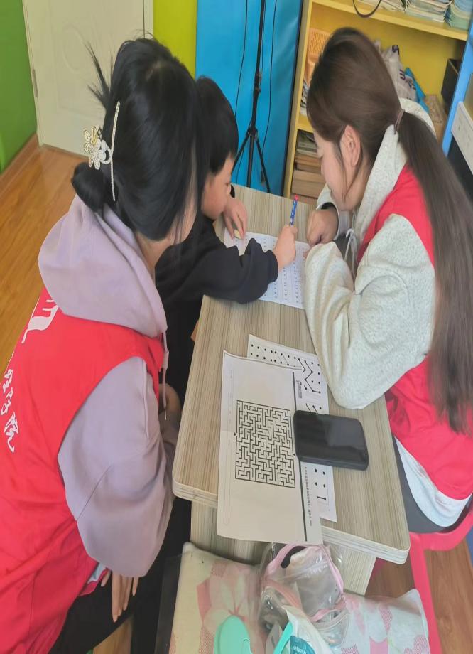 活动期间志愿者在特教老师的指导和帮助下,为儿童进行相关语言和行为的康复训练,指导儿童完成康复训练作业,志愿者积极热情的为孩子们加油、鼓劲,用他们的热情与耐心温暖每一个孩子幼小的心灵。