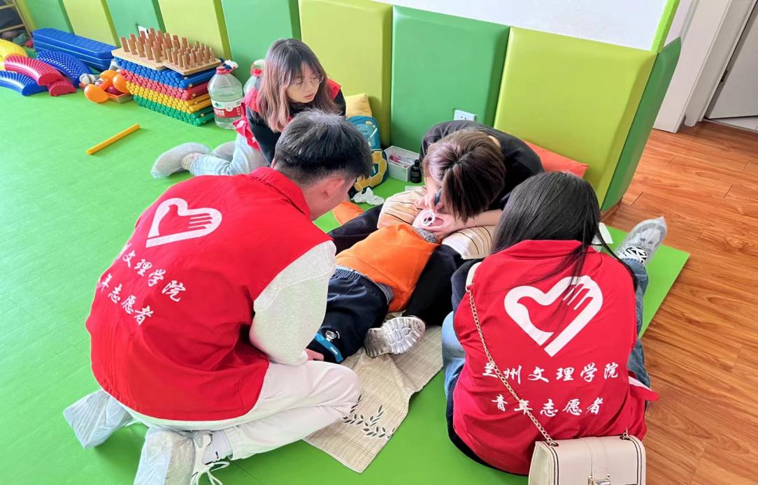 图为志愿者们帮助老师为儿童进行康复训练