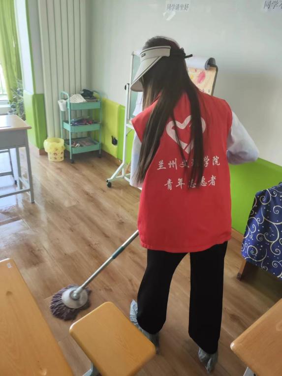 图为志愿者们打扫卫生的场景