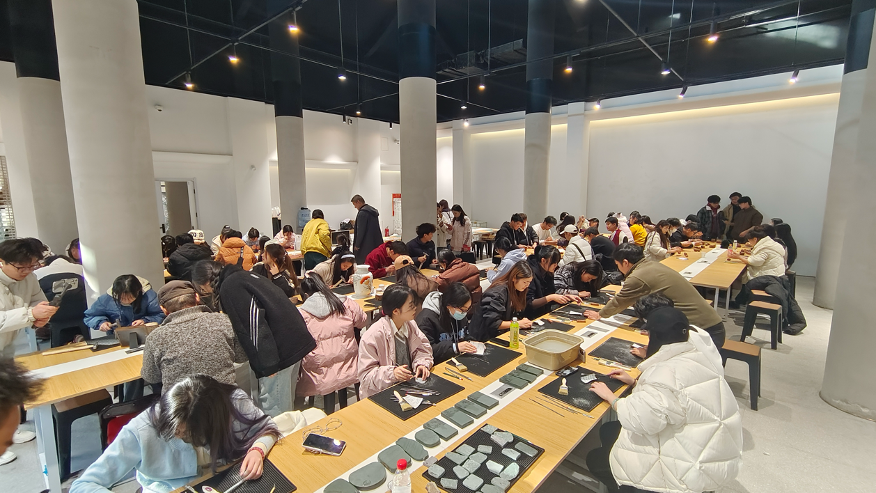 此次研学活动中,多位非遗传承人及相关领域专家在现场进行指导。学生们体验了蛋雕、铜板堑花、掐丝珐琅画、锲金画及砚台创作五项传统非遗手工艺。在传承人的悉心教导下,学生们热情投入,在不同材质上精心雕刻、捶打、打磨,深切感受传统手工艺的独特魅力,并创作出各自的作品。