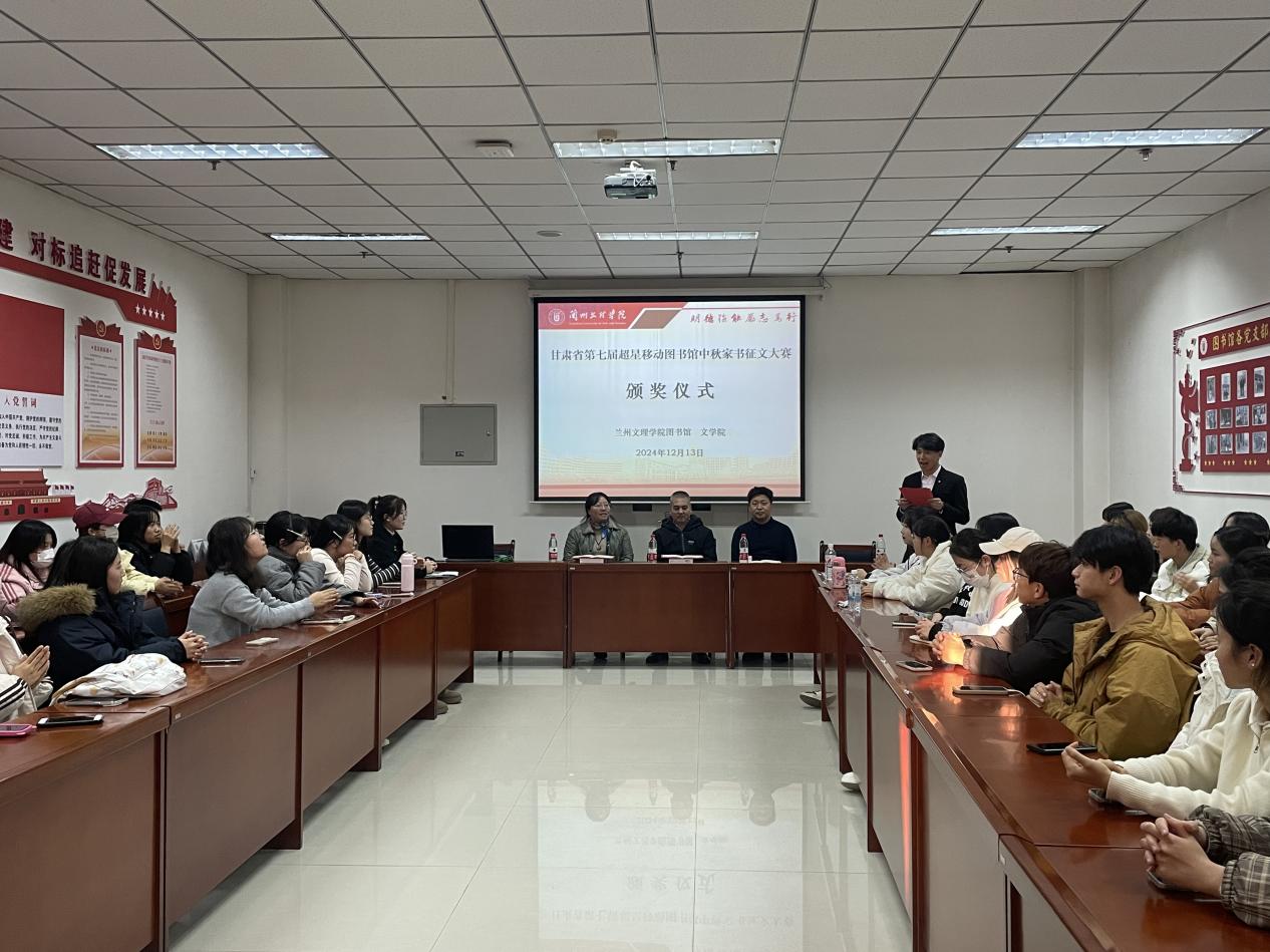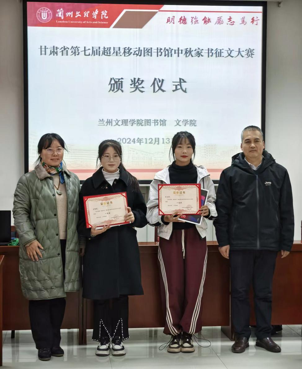 近日,甘肃省第七届超星移动图书馆“中秋家书”征文大赛圆满落幕,我院学子在此次征文大赛中荣获佳绩。12月13日,永利官网图书馆和yl9193永利集团于图书馆会议室联合举办“中秋家书”征文大赛颁奖仪式。图书馆馆长胡建军、副馆长刘忠、yl9193永利集团院长叶淑媛出席并为获奖学生颁奖。