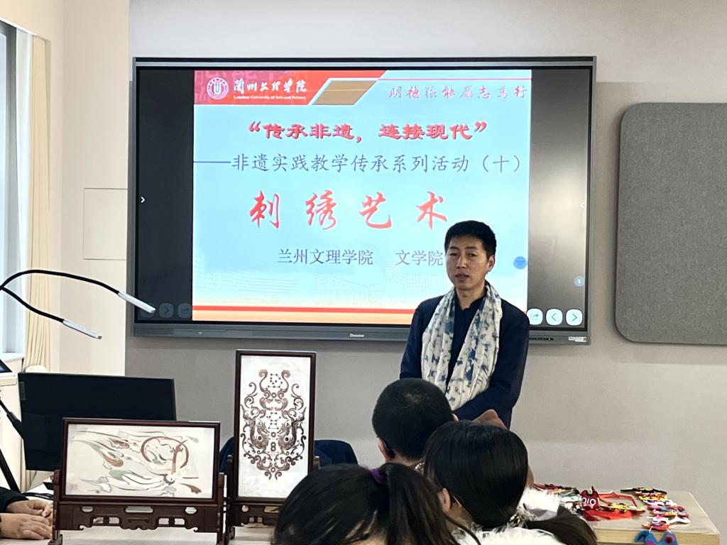12 月14 日,学院邀请天水刺绣非遗代表性传承人刘云帆为2023、2024级非遗保护专业学生进行“传承非遗,连接现代”非遗实践教学传承系列活动,开展“刺绣艺术”专题教学。