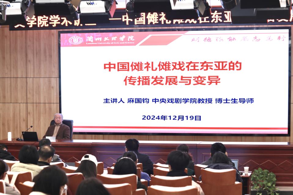 12月19日下午,应yl9193永利集团邀请,中央戏剧学院教授、博士生导师、文化部优秀专家麻国钧教授在我校学术报告厅为yl9193永利集团师生作了题为“中国傩礼傩戏在东亚的传播发展与变异”的学术讲座。讲座由yl9193永利集团院长叶淑媛教授主持,yl9193永利集团教师、甘肃傩面艺术传承人及23级非遗、戏文与24级汉语言文学专升本专业学生参加。