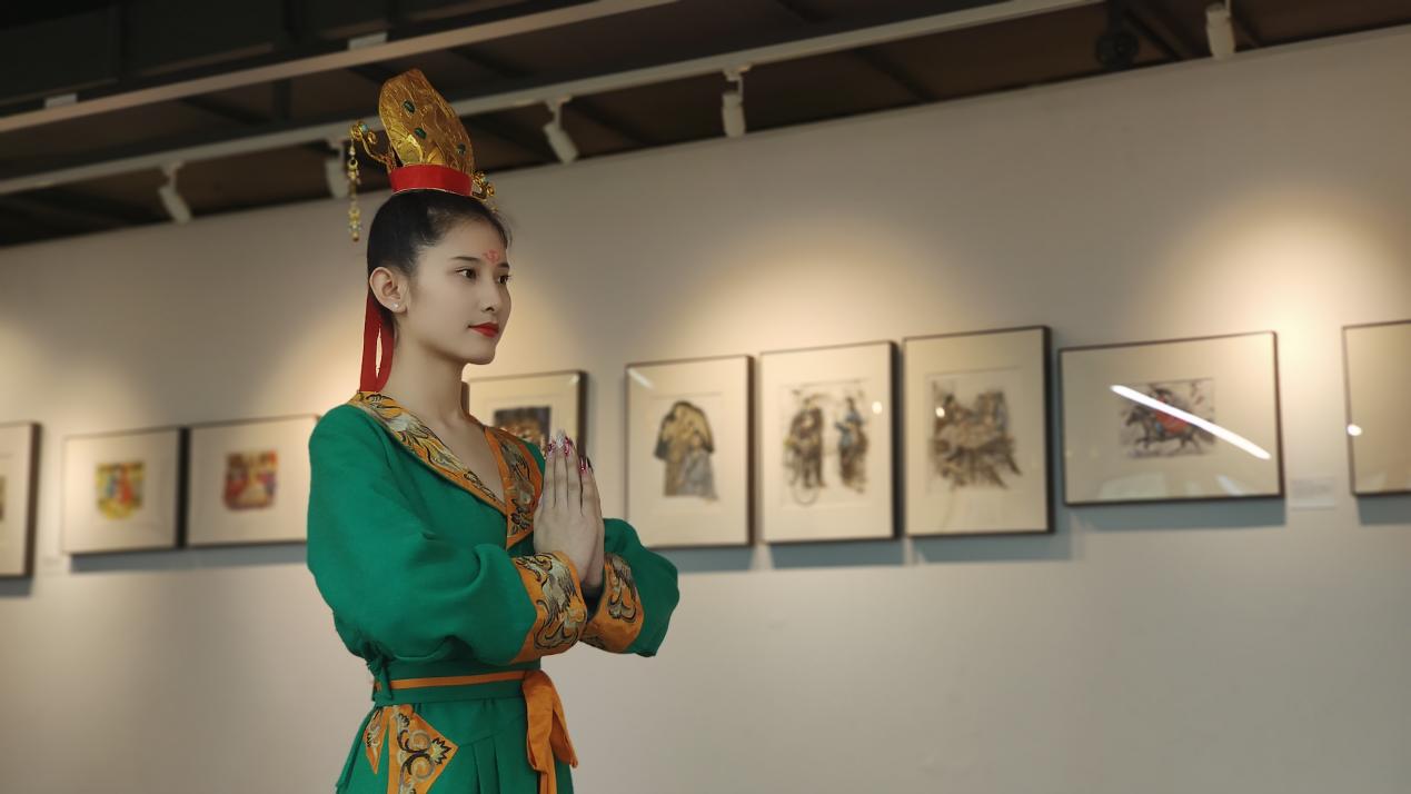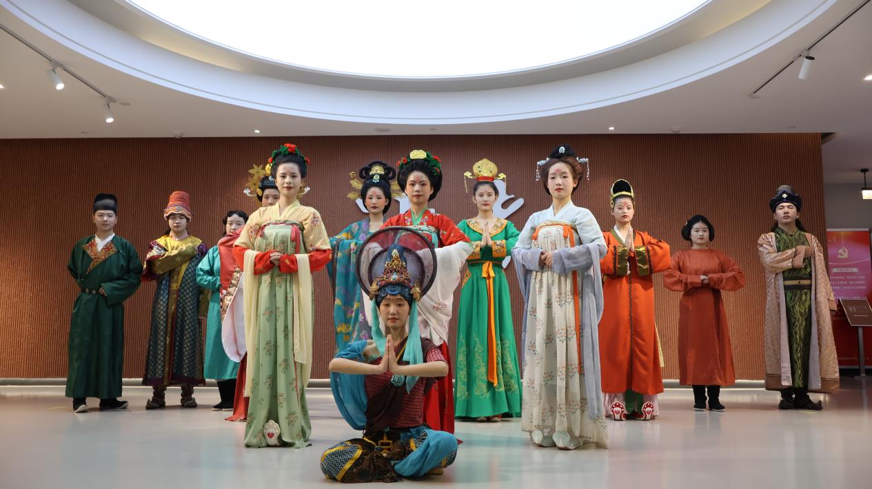活动现场,yl9193永利集团学生参与了敦煌服饰秀活动,他们身着14套不同历史时期的敦煌服饰惊艳亮相,展现了从魏晋到隋唐的千年文化变迁。这些服饰的色彩、纹样、制式均复刻自莫高窟的经典洞窟,石青、赭红、鎏金等传统色彩的交织,将敦煌古韵完美呈现。随着古乐声起,学生们化身“文化使者”,以灵动的肢体语言,带领观众穿越时空领略敦煌艺术韵味。