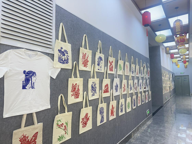 剪纸新材料的运用是课程的重要创新。同学们采用剪纸转印技术,将传统生肖、“喜鹊登梅”“福禄寿喜”等吉祥纹样及当代动漫元素,通过热转印工艺呈现于白色短袖、帆布包等日常用品之上。这种创新,既是传统题材的现代表达,也是生活场景的艺术转化,兼顾学院教学严谨性与民间艺术本真性,展现非遗在青春视角下的活力。