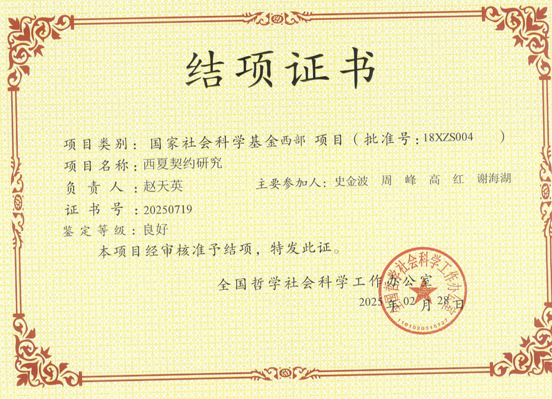 yl9193永利集团赵天英老师主持的国家社科基金项目《西夏契约研究》顺利结项,获评“良好”等级。该项目前期产出4篇论文(含2篇C刊),最终成果达60万字。